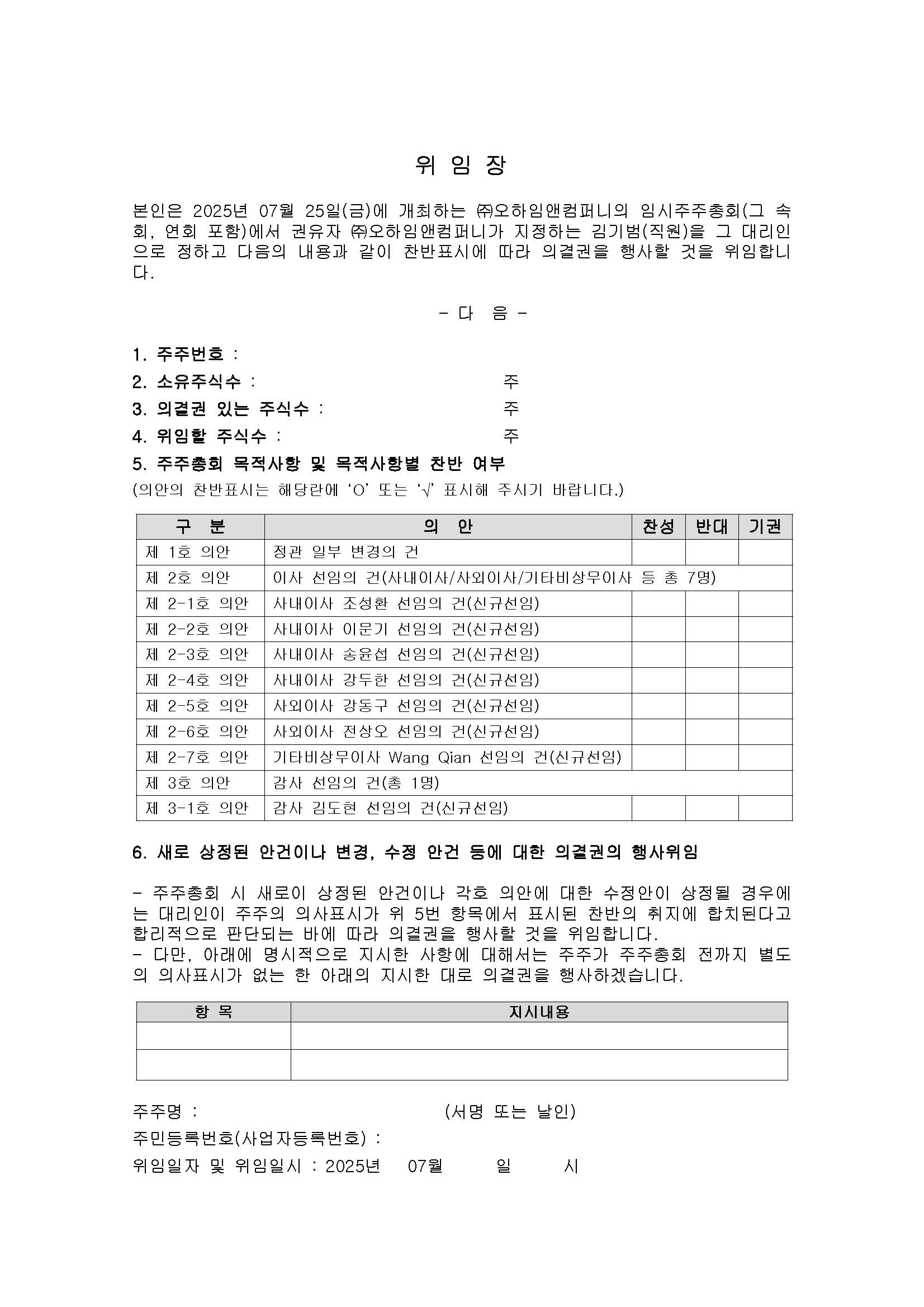 2025년 07월 10일 금융감독원전자공시시스템에 제출한 ‘의결권대리행사권유참고서류’에 따라 당사 임시주주총회의 서면위임장 용지를 게시합니다.